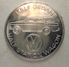 Volkswagen"1969" giveaway advertising medallion featuring the Station Wagon. Made in the United States, this medallion or coin serves as a unique piece that showcases the vintage charm of the Volkswagen vehicle. Perfect for collectors or enthusiasts of vintage cars. Measures 1/1/2" in diameter and has a silver aluminum finish as shown. Dated on reverse and hard to find.