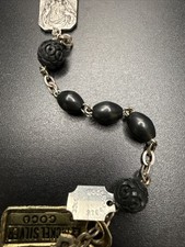This product is a vintage 20" Nickel Silver Ebony Black Coco Bead Catholic Rosary from France. It is a beautiful and unique piece of religious decor, perfect for any Christian looking to add a special touch to their faith practices. The intricate details and materials used in this rosary make it a valuable collectible item, embodying the spirit of Christianity and spirituality. Made with silver and featuring ebony black coco beads, this rosary is a testament to the faith and devotion of its origin.