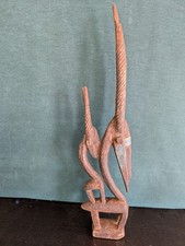 VTG 21" AFRICAN Wood Metal & Shell CHIWARA Antelope Headdress Bamana SculptureOne antler on the larger head is chipped & shorter than the other & one antler on the smaller head has a crack, but not all the way through & is secure.Complete with Metal face and traditional cowry shell earing