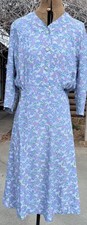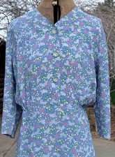 A home made garment. The hem does not sit evenly until you use a belt, no belt. Hand sewn buttonholes. Lightweight rayon with nice drape, ditzy floral on light blue. Bust 40". Pullover style, no side zip. Waist 33". Shoulder width 16.5". Skirt length 27". Sleeve length 18". Unfinished seams inside. Clean.