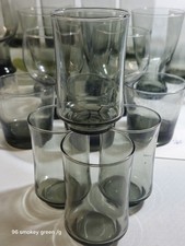 Color: Described as "smokey green" or "smoke grey," a popular palette for 1960s and 70s barware. Versatility: The set includes a variety of shapes: tall iced tea tumblers, lowball juice glasses, rounded wine/water goblets, and small cordial or shot glasses.