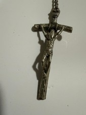 Brand: Unbranded Item: True Vintage Catholic rosary with alternating black and white glass beads on a metal chain. Design: Features a detailed silvertone metal crucifix with bark-textured cross and raised INRI plaque at the top. Center medal: Rectangular double-sided medal with relief image of the Virgin Mary on one side and Jesus on the other, stamped "ITALY" at the bottom. Material: Glass beads with metal chain, crucifix and center medal, made in Italy. Use: Suitable for daily prayer, devotional use, or as a meaningful religious gift or display piece. Keywords: Catholic rosary, black and white beads, Italian rosary, metal crucifix, Marian devotion
