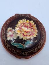 This vintage brown compact features painted flowers on its round surface, adding a charming touch to the classic design. The compact is small, measuring 4 inches in diameter, making it perfect for on-the-go touch-ups. With its mirrored interior, this compact allows you to apply your favorite lipsticks or blushes with ease. Its compact size and unique design make it a prized collectible for vanity, perfume,