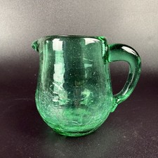 Vtg Emerald Green Crackle Glass Creamer Pitcher Mini Jug Hand Blown MCM 2.75" Tall This vintage hand-blown emerald green crackle glass creamer pitcher features a beautiful textured crackle pattern throughout the body, a matching applied handle, and a classic spout for pouring. The deep green color catches the light beautifully, showing bubbles and variations typical of artisanal crackle glass from the mid-century era. Perfect as a decorative accent, small vase, or functional creamer/syrup server for MCM or vintage glass collections. Images are a part of the description. Please review all images for additional information, including condition and dimensions.