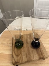 Vtg Hand Blown Glass Pilsner Set of 2 Clear Colored Bubble Bases Green Blue