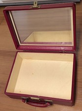 Vtg LUCE Suitcase Cosmetic Vanity Travel Case Red with large interior mirror inside the lid. Likely manufactured around the1930s - 50s. Outer dimensions: 9" x 12" x 4.5". Faux textured leather. Hardware has a brass finish.
