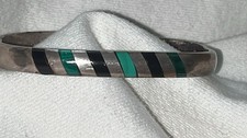 • Material: Sterling silver with stone inlay. Inlay stones appear secure. • Style: Open cuff bracelet.