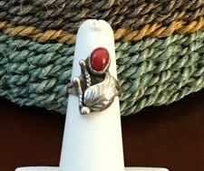 Size 4-3/4. The highly polished coral stone is bezel set with a Sterling Silver Leaf and designs around it.