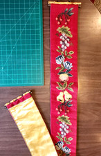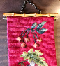 Needlepoint bell pull in good used condition. Fruit motif on a red colored background. bamboo endpieces, as shown in photos.