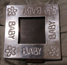 This Pewter Mini Square Baby Picture Frame is a handmade piece made in Mexico. The frame features a silver color and a theme specifically catered towards babies, making it a perfect addition to any nursery decor. The wooden easel back adds a touch of folk art and makes it easy to display the frame anywhere in the room, suitable for both boy and girl babies. With its unique craftsmanship and design, this picture frame is a charming way to showcase your little one's photos with a touch of Mexican flair.