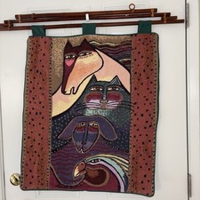 (Size: 25” wide X 29” Long) bamboo rod length: 35.5” widest length) The VTG Rare Wall Tapestry by Laurel Burch is a unique and colorful piece of art from the 1970s. Featuring intricate designs of cats, goats, horses, and eagles, this large tapestry is signed by the artist themselves. Made of cotton and bamboo with a vertical orientation, this vintage tapestry is perfect for adding character to any wall in your home. The 25" Bamboo Rod makes hanging easy and elegant, making this a beautiful addition to any antique or vintage decor collection.