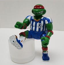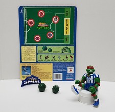 Based on online photos, I believe this set is complete with accessories. Included accessories are: 1 soccer goal, 1 turtle-textured soccer ball and 1 flattened football as seen in the photos. Raph's right leg stays in an up position.