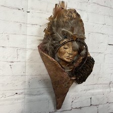 A very unique piece Rather heavy This item is a decorative wall sculpture featuring a sculpted face, likely made of clay or papier-mâché, adorned with feathers and fiber elements. Design: A tranquil face with closed eyes is nestled within a textured shell-like form, topped with a feathered headdress. Art Style: The piece blends elements of tribal art with mixed-media techniques to create a rustic, bohemian aesthetic. BR1 Wall Art Mixed Media Tribal Woman Face Tranquil Feathers Fabric
