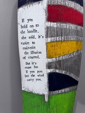Wooden art piece to hang on your wall. You can check them out on their website. It is35 in long and 7.5 in wide.