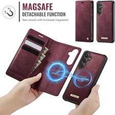 Wallet Case for Samsung Galaxy S24 Plus Compatible with Magsafe, 2-in-1 PU Leather Flip RFID Blocking Card Holder Stand Shockproof Magnetic Detachable Cover for Galaxy S24 Plus, Burgundy. Features 3 card slots with RFID blocking technology to protect against unauthorized scanning.