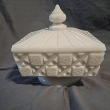 Westmoreland Milk Glass Square Pedestal Candy Dish With Lid - Old Quilt Pattern