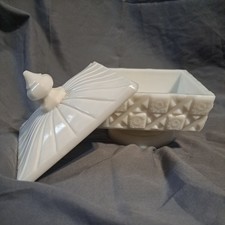 The Westmoreland Milk Glass Square Pedestal Candy Dish with Lid in the Old Quilt pattern is a vintage piece of American decorative cookware made in Pennsylvania during the 1940s. This retro-style candy dish features a glossy white finish with a quilted pattern, making it a unique and decorative addition to any collection. Hand wash only, this dish has a capacity of 8-12 oz