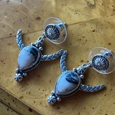 These unique dangle earrings are made with 4.10 ctw. of real, earth mined white buffalo, also known to some as white turquoise or white buffalo turquoise. The earrings are set in solid .925 sterling silver with a black oxidized finish for more of a vintage look. The earrings in the photos are the actual ones you will receive, so please see photos for gemstone quality and measurements. These stones are guaranteed to be genuine white buffalo, and I encourage my buyers to get their items tested by a jeweler. These stones are not zebra jasper, white Howlite, or any other stone commonly replaced for white buffalo. These stones came from a reputable source and are guaranteed to be authentic. Inventory: J5