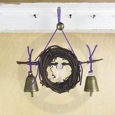 A simple tapered bell is hung at each end of the twig with purple cord, and in the middle of the wreath is mounted a point of clear quartz crystal using bronze-colored crafting wire. The wreath is hung with another matching length of purple cord which is loosely threaded at the top through a smaller sleigh bell.