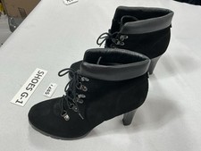 These women's size 9M Lauren Ralph Lauren chunky ankle boots in black are a stylish and versatile addition to any wardrobe. The classic lace-up closure and 4” ultra-high heel make them perfect for adding a touch of sophistication to any outfit. Made of suede with a comfortable M shoe width, these boots are in excellent condition and ready to make a statement. These boots are pre owned and look on the outside to be in excellent condition but the label peeled on the inside!