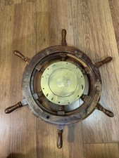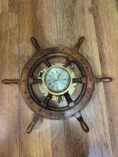 Wood Brass Ship's Wheel Clock Antique Style Nautical Maritime Wall Decor Vintage