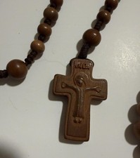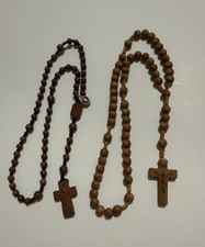Brand: Unbranded Item: Set of two wood Catholic rosary bead necklaces with carved crucifix crosses. Material: Smooth round wooden beads on braided cord with matching wood crosses. Design: One rosary features a carved corpus figure with INRI banner on the front of the cross and Korean text engraved on the back. Design details: Second rosary has a stylized corpus carving on the cross, dove emblem and Korean text on the back, and a wood center medal with Miraculous Medal style imagery plus attached metal Divine Mercy image and Chi-Rho symbol charm. Use: Suitable for daily prayer, devotional use, Catholic gifts, or home altar display. Keywords: wooden rosary, Catholic prayer beads, crucifix cross, Christian devotional, Korean rosary lot