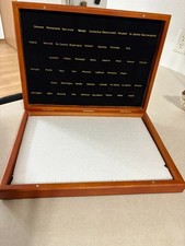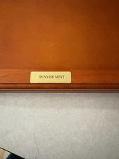 his is a wooden coin collector box. Used but in excellent shape has the name plate of the " Denver Mint" on the top of the outside near the lower center. Closes with magnetic chips along edging. On the inside of top in has the 50 states each name printed on the felt. It is 12-inch x 9-inch x 2 1/2 inch deep.
