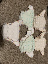 2 EcoAble- tag says one size 10-35lbs 2 blue/green colored ones have no tag with size, but run the same as the ecoAble 1 on the bottom has a worn off tag, unsure of size, slightly smaller that the other 4. Is missing one small pad. Slight staining as pictured. All snaps and elastics are good.