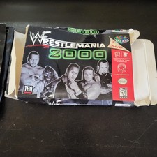 The product is an authentic box and manual for WWF Wrestlemania 2000 for the Nintendo 64 console. It is produced by THQ and made in the United States.