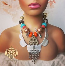 Orange Batik Bone Beads. Dynamic CHUNKY Layered African Showpiece. XL Turquoise Howlite Beads. Nigerian Brass Globe Bead s. Antique Terra Cotta / Red Hued Stone Beads. Bib Chain Pendant. Layered Brushed Silver Bib/Fan Art Pieces.