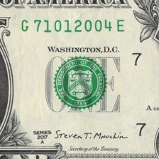 Year Note 2004 in the Serial Number $1 Dollar Bill Trailing Position G71012004E