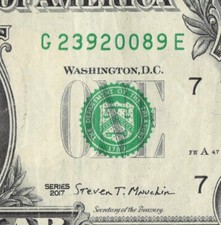 Year Note 2008 in the Serial Number $1 Dollar Bill Center Position G23920089E