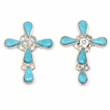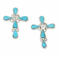 Zuni Turquoise and Silver Cross Earrings by Vacit Delicate tiny sterling silver cross earrings featuring turquoise channel inaly, handcrafted by Bryce Vacit. (Hallmark: Unsigned) Earrings are 1'" long, 5/8" wide and weigh 2.7 grams combined.